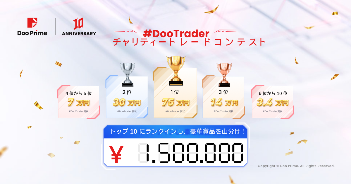 Doo Prime は設立10周年を記念して、日本初の#DooTraderチャリティートレードコンテストを開催します。本コンテストでは日本国籍のお客様向けに、円建て取引口座が用意されています。